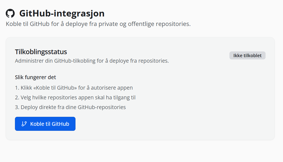 Bare opprett en gratis konto på AppHost.no eller ta kontakt med oss. Det vil være bugs i starten, men som nevnt bruker vi og flere kunder allerede løsningen slik at de mest vanlige funksjoner vil fungere godt og stabilt. Typisk oppsett som kjører hos oss er prosjekt utviklet i Replit/Lovable/ClaudeCode innsjekket i GitHub og som trenger en postgres-database ved deploy. Vi støtter også MariaDB, men de fleste testere/apper kjører Postgres og vi anbefaler nok dette per nå for apper laget ved hjelp av AI.