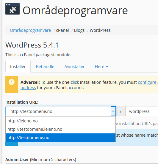 Når du skal installere WordPress og andre ting, så vil minbutikk (eller hva domene du legger til) vises i nedtrekksmenyer slik at det blir installert til riktig katalog. Slik som vist her, eksempel med testdomene.no som er lagt oppå webhotell som allerede finnes: