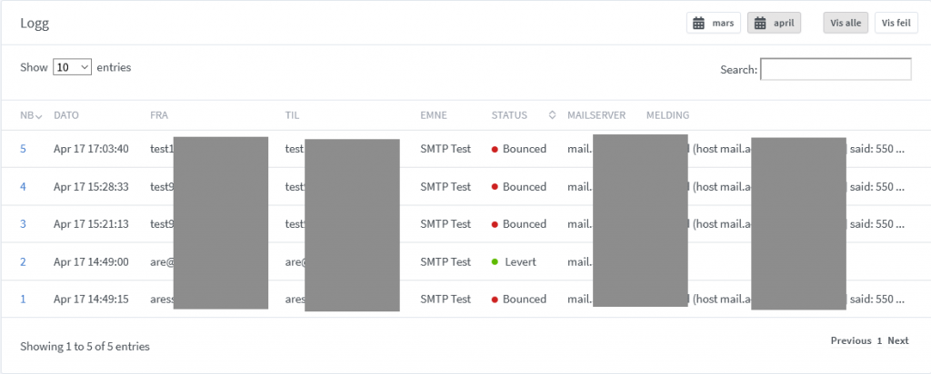 Vi har også forbedret loggen, slik at den som standard viser alle e-poster for inneværende måned – og man kan velge å vise også for måneden før. Videre kan man filtrere kun på de som inneholder feil – eller se alle.