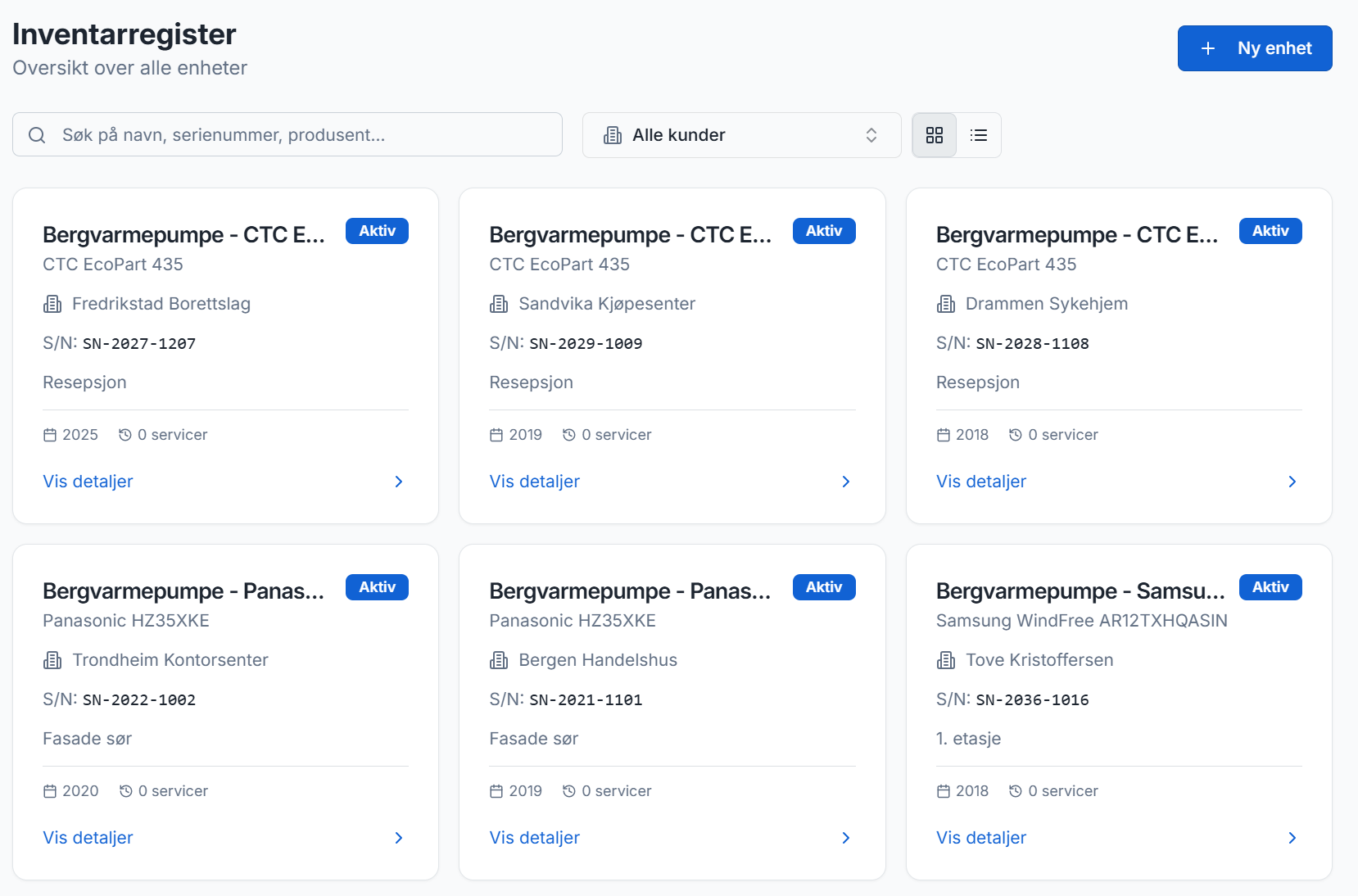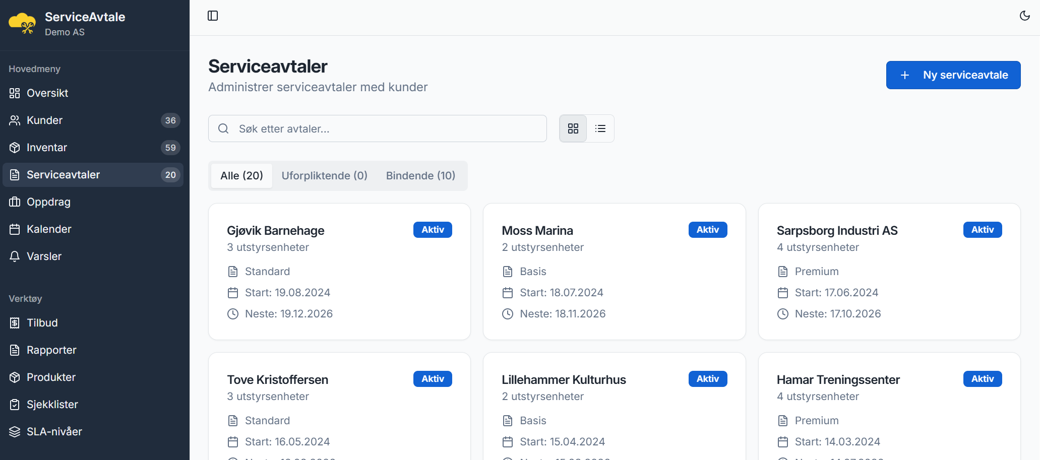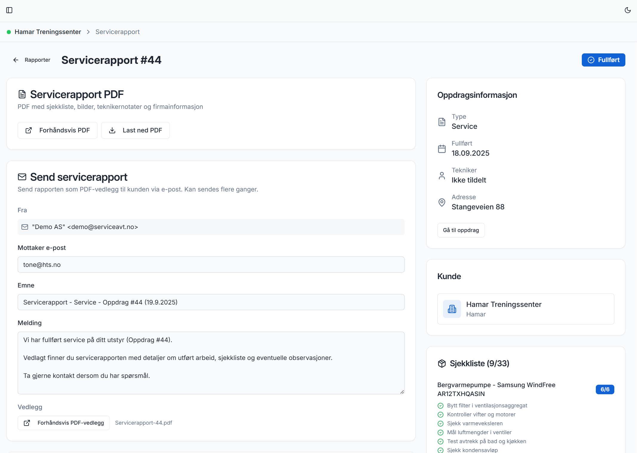 Med ServiceAvtale kan du registrere alt utstyr med serienummer og plassering, knytte det til kunder og avtaler, og la systemet automatisk sende påminnelser når service er på tide — via e-post og SMS. Etter utført service genererer du en profesjonell PDF-rapport med sjekkliste, bilder og notater som sendes direkte til kunden.