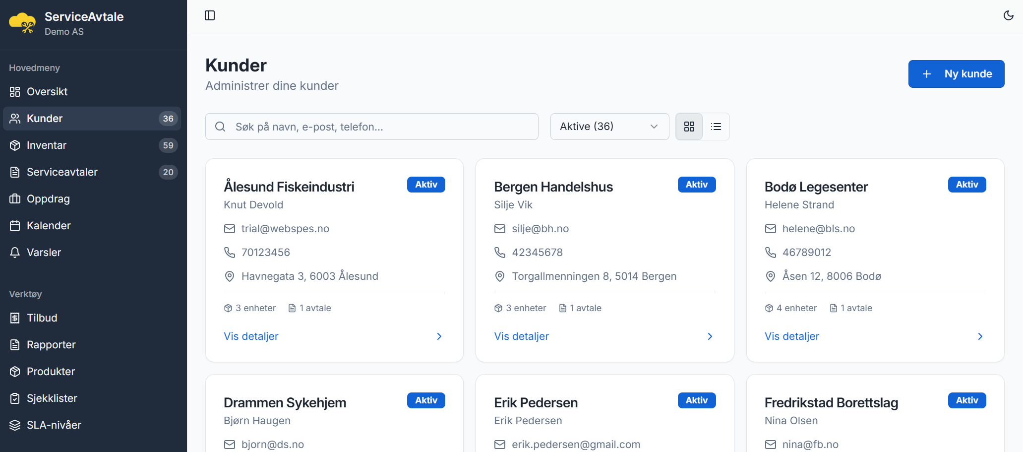 ServiceAvtale fra Webspesialisten gir bedriften din full kontroll over serviceavtaler, kunder og utstyr i én oversiktlig plattform. Systemet er bygget for håndverkere og servicebedrifter som trenger struktur på vedlikeholdsavtaler, automatiske påminnelser og profesjonell oppfølging av kunder.