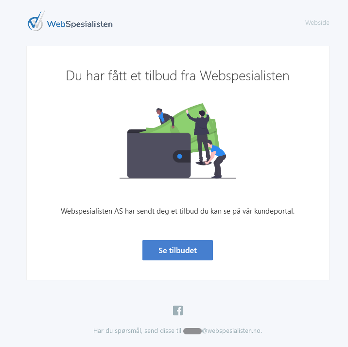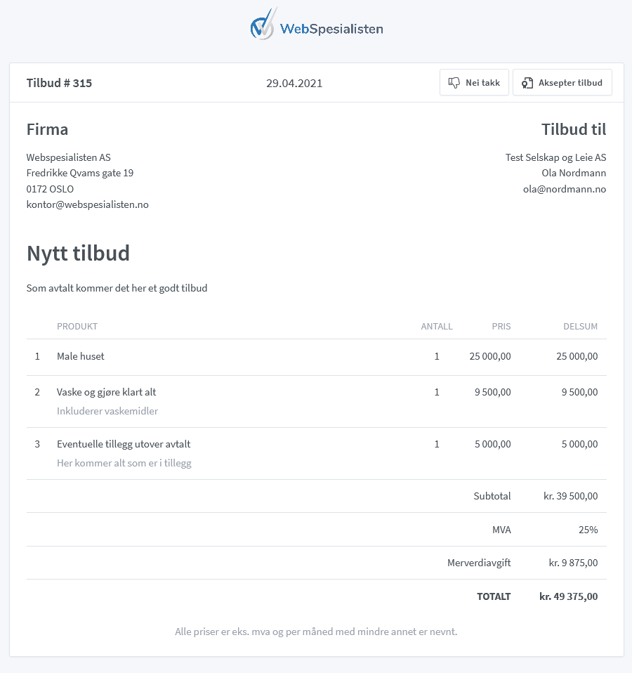 Vår enkle skytjeneste lar deg enkelt sette opp tilbud og sende til kunden på en rask og pent presentabel måte. E-posten kunden får ser slik ut: